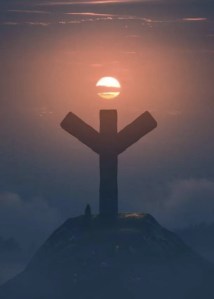 the shape of Algiz rune in a mystic sunset
