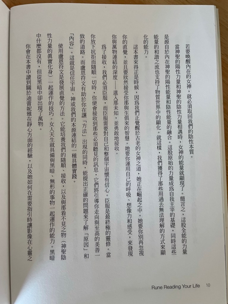 我們知道盧恩與北歐、維京民族息息相關,也因此一般而言,可能會認為盧恩符文是充滿力量、陽剛、戰鬥風格。然而在作者的解讀之中,更偏向一點哲學、宇宙、臣服的風格,這也是我很欣賞的一點。把盧恩的智慧帶入生活之中,不僅僅作為占卜,更能自然的在潛意識之中運行盧恩符文的能量,這不就是我們說的盧恩魔法能量嗎?!