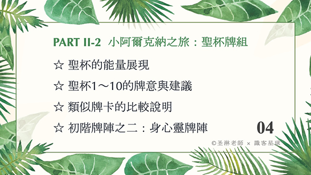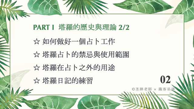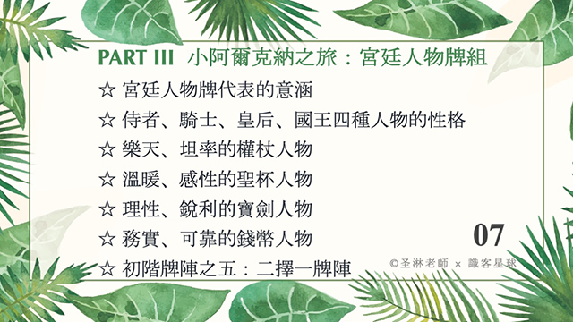 聖淋老師的塔羅是以邏輯、理性思考的方式傳授,很適合為塔羅的基本概念打底。