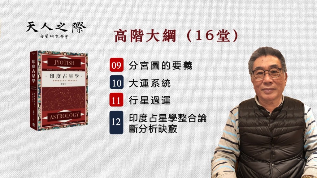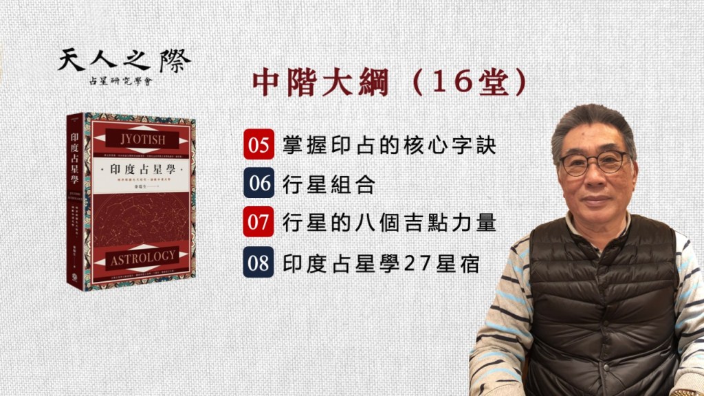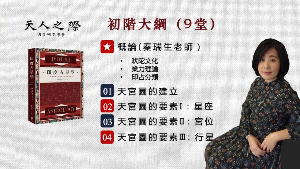 🎯 講義及課前準備:課堂搭配PPT,並提供重點摘要講義下載。學員需要自備秦瑞生老師著作《印度占星學》作為課程用書。